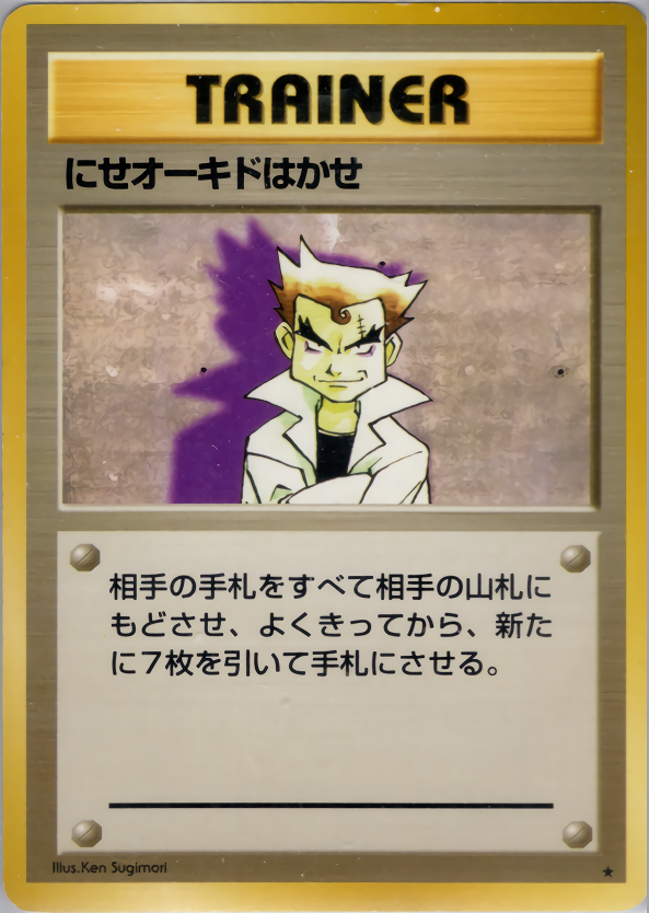 相手の手札をすべて相手の山札にもどさせ、よくきってから、新たに7枚を引いて手札にさせる。