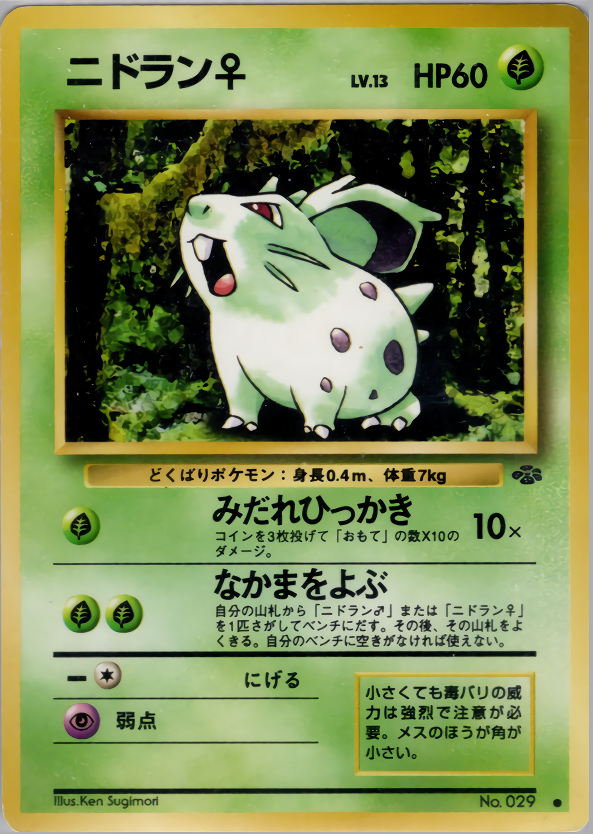 自分の山札から「ニドラン♂」または「ニドラン♀」を1匹さがしてベンチにだす。その後、その山札をよくきる。自分のベンチに空きがなければ使えない。