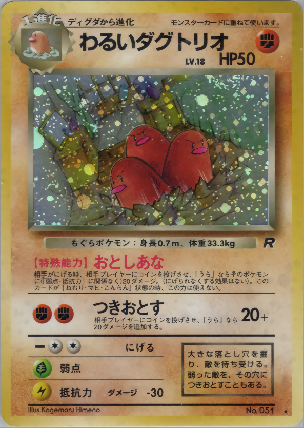 相手がにげる時、相手プレイヤーにコインを投げさせ、「うら」ならそのポケモンに(「弱点・抵抗力」に関係なく)20ダメージ。(にげられなくする効果はない)。このカードが「ねむり・マヒ・こんらん」状態の時、この力は使えない。