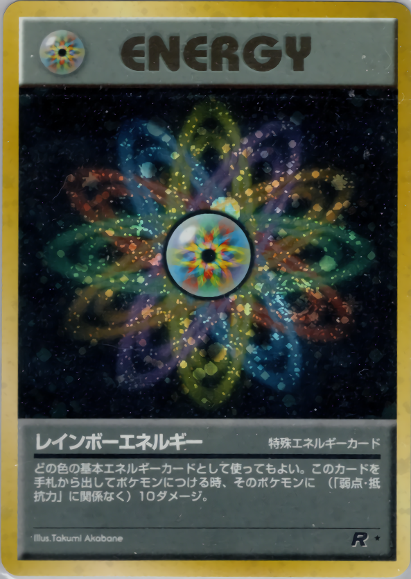 どの色の基本エネルギーカードとして使ってもよい。このカードを手札から出してポケモンにつける時、そのポケモンに(「弱点・抵抗力」に関係なく)10ダメージ。
