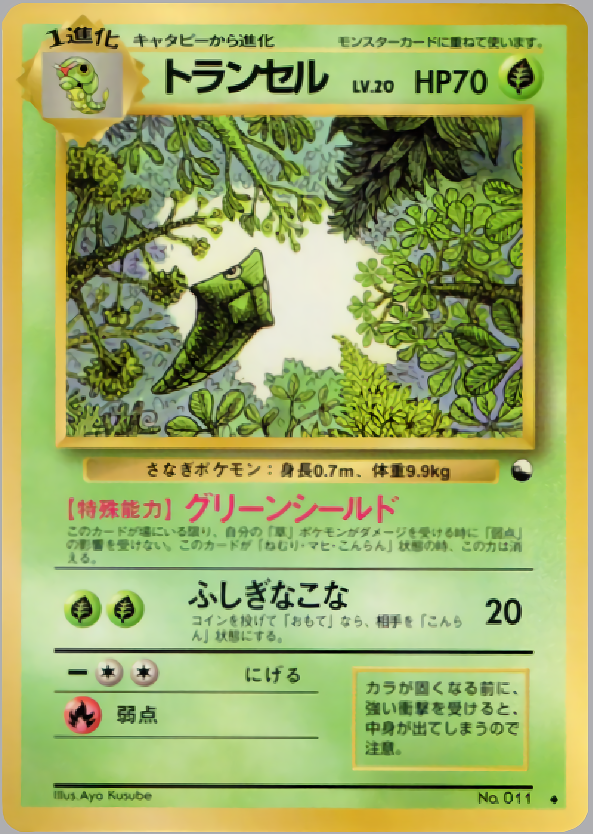 このカードが場にいる限り、自分の「草」ポケモンがダメージを受ける時に「弱点」の影響を受けない。このカードが「ねむり・マヒ・こんらん」状態の時、この力は消える。