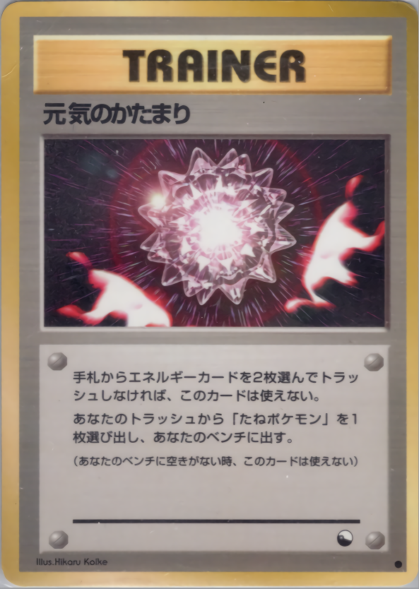 手札からエネルギーカードを2枚選んでトラッシュしなければ、このカードは使えない。あなたのトラッシュから「たねポケモン」を1枚選び出し、あなたのベンチに出す。(あなたのベンチに空きがない時、このカードは使えない)