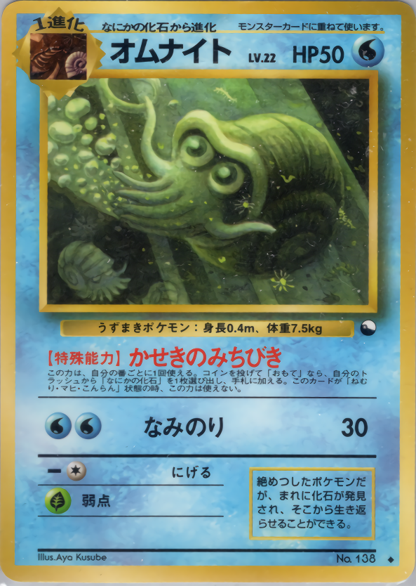この力は、自分の番ごとに1回使える。コインを投げて「おもて」なら、自分のトラッシュから「なにかの化石」を1枚選び出し、手札に加える。このカードが「ねむり・マヒ・こんらん」状態の時、この力は使えない。
