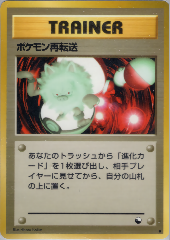 あなたのトラッシュから「進化カード」を1枚選び出し、相手プレイヤーに見せてから、自分の山札の上に置く。