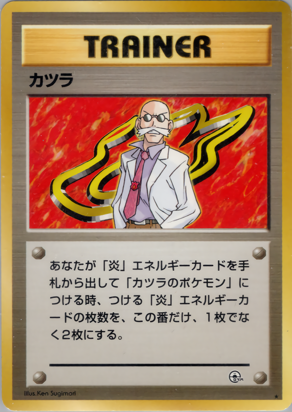 あなたが「炎」エネルギーカードを手札から出して「カツラのポケモン」につける時、つける「炎」エネルギーカードの枚数を、この番だけ、1枚でなく2枚にする。