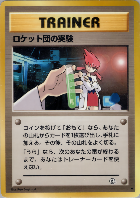 コインを投げて「おもて」なら、あなたの山札からカードを1枚選び出し、手札に加える。その後、その山札をよく切る。「うら」なら、次のあなたの番が終わるまで、あなたはトレーナーカードを使えない。
