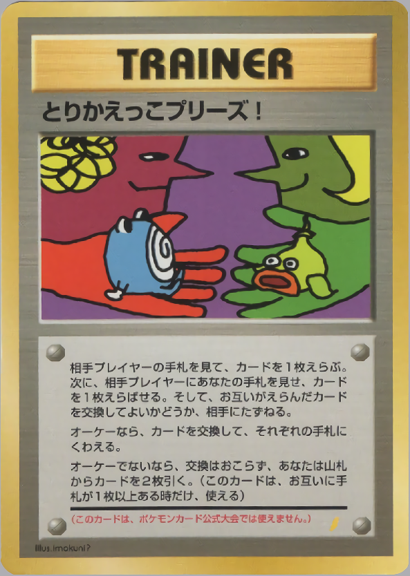 相手プレイヤーの手札を見て、カードを1枚えらぶ。次に、相手プレイヤーにあなたの手札を見せ、カードを1枚えらばせる。そして、お互いがえらんだカードを交換してよいかどうか、相手にたずねる。オーケーなら、カードを交換して、それぞれの手札にくわえる。オーケーでないなら、交換はおこらず、あなたは山札からカードを2枚引く。(このカードは、お互いに手札が1枚以上ある時だけ使える)