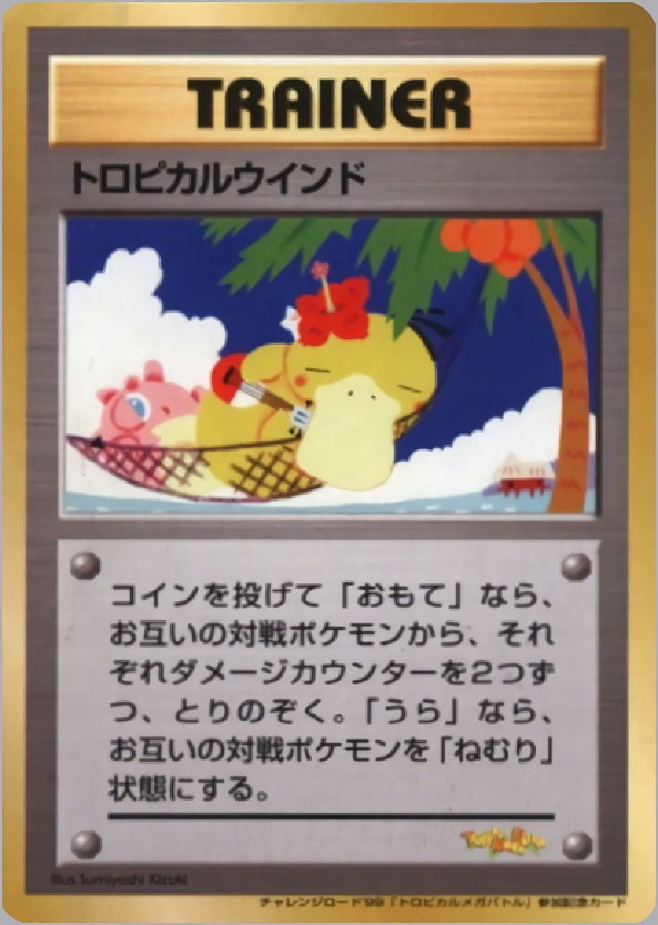 コインを投げて「おもて」なら、お互いの対戦ポケモンから、それぞれダメージカウンターを2つずつ、とりのぞく。「うら」なら、お互いの対戦ポケモンを「ねむり」状態にする。