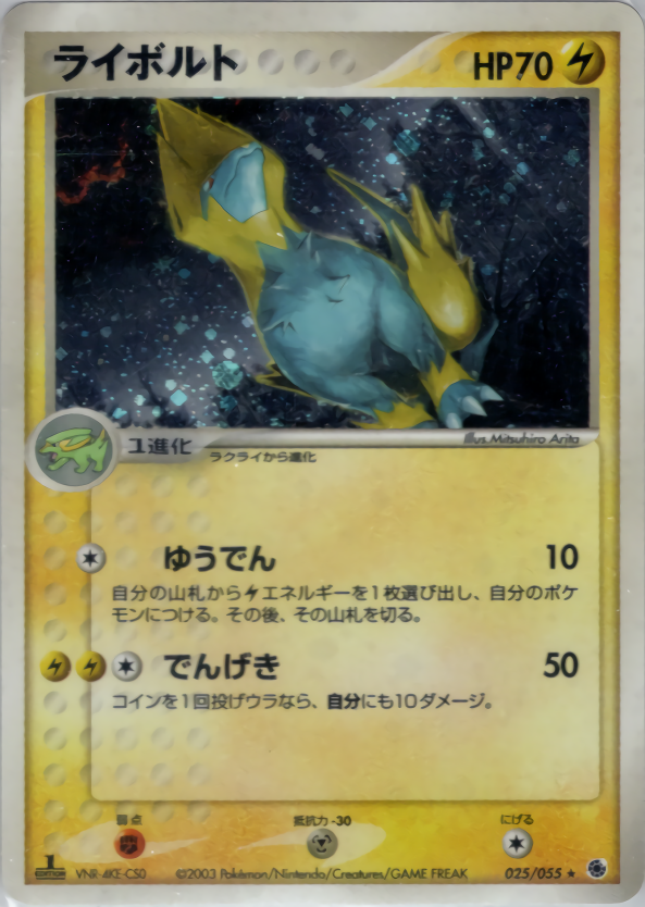 自分の山札から雷エネルギーを1枚選び出し、自分のポケモンにつける。その後、その山札を切る。