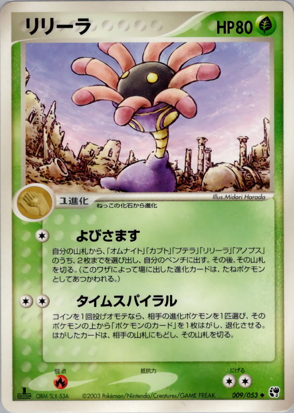 自分の山札から、「オムナイト」「カブト」「プテラ」「リリーラ」「アノプス」のうち、2枚までを選び出し、自分のベンチに出す。その後、その山札を切る。(このワザによって場に出した進化カードは、たねポケモンとしてあつかわれる。)