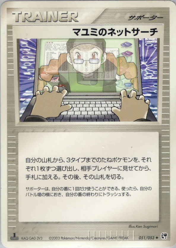 自分の山札から、3タイプまでのたねポケモンを、それぞれ1枚ずつ選び出し、相手プレイヤーに見せてから、手札に加える。その後、その山札を切る。