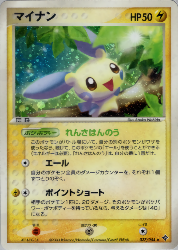 相手のポケモン1匹に、20ダメージ。そのポケモンがポケパワー・ポケボディーを持っているなら、与えるダメージは「40」になる。