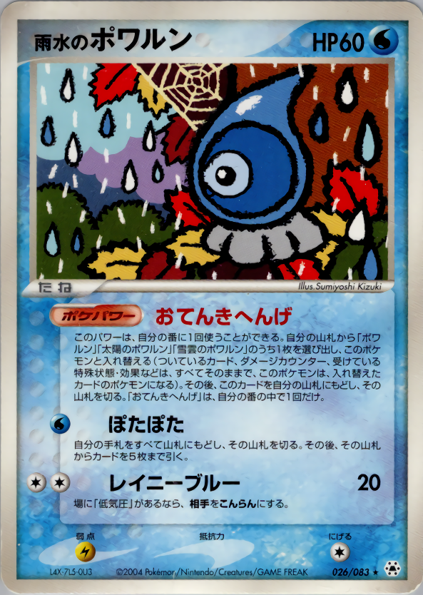 このパワーは、自分の番に1回使うことができる。自分の山札から「ポワルン」「太陽のポワルン」「雪雲のポワルン」のうち1枚を選び出し、このポケモンと入れ替える(ついているカード、ダメージカウンター、受けている特殊状態・効果などは、すべてそのままで、このポケモンは、入れ替えたカードのポケモンになる)。その後、このカードを自分の山札にもどし、その山札を切る。「おてんきへんげ」は、自分の番の中で1回だけ。