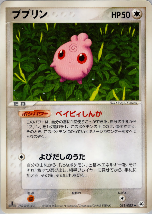 このパワーは、自分の番に1回使うことができる。自分の手札から「プリン」を1枚選び出し、このポケモンの上にのせ、進化させる。そのとき、このポケモンにのっているダメージカウンターをすべてとりのぞく。