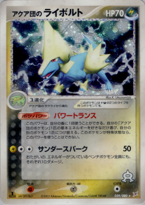 このパワーは、自分の番に1回使うことができる。自分の「アクア団のポケモン」1匹の基本エネルギーを好きなだけ選び、自分の別のポケモン1匹につけ替える。このポケモンが特殊状態なら、このパワーを使うことはできない。