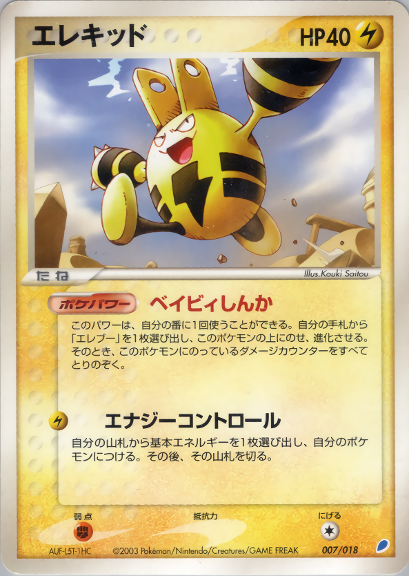 このパワーは、自分の番に1回使うことができる。 自分の手札から「エレブー」を1枚選び出し、このポケモンの上にのせ、進化させる。 そのとき、このポケモンにのっているダメージカウンターをすべてとりのぞく。