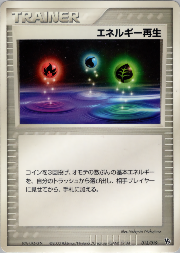 コインを3回投げ、オモテの数ぶんの基本エネルギーを、自分のトラッシュから選び出し、相手プレイヤーに見せてから、手札に加える。