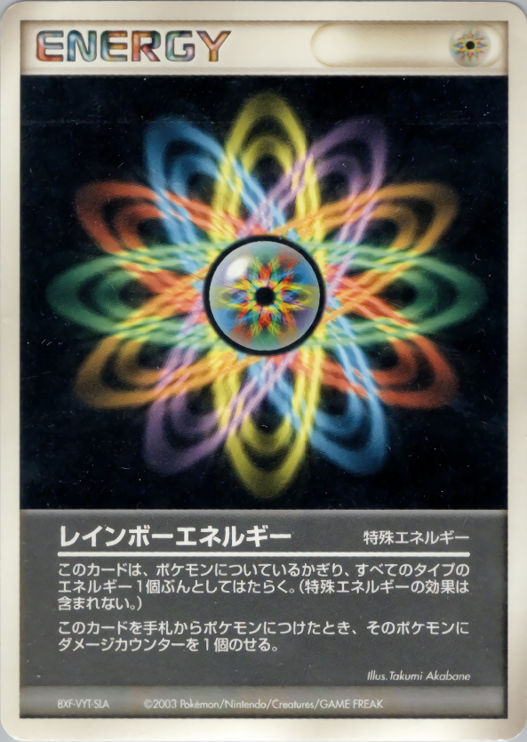 このカードは、ポケモンについているかぎり、すべてのタイプのエネルギー1個ぶんとしてはたらく。(特殊エネルギーの効果は含まれない。)このカードを手札からポケモンにつけたとき、そのポケモンにダメージカウンターを1個のせる。