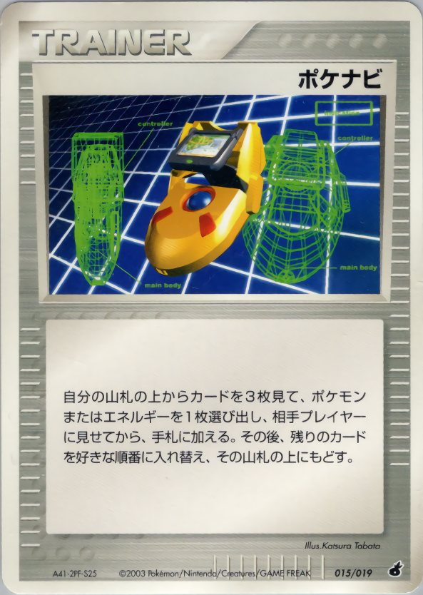 自分の山札の上からカードを3枚見て、ポケモンまたはエネルギーを1枚選び出し、相手プレイヤーに見せてから、手札に加える。その後、残りのカードを好きな順番に入れ替え、その山札の上にもどす。