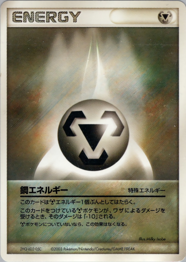 このカードは鋼エネルギー1個ぶんとしてはたらく。このカードをつけている鋼ポケモンが、ワザによるダメージを受けるとき、そのダメージは「-10」される。