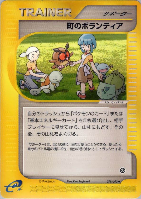 自分のトラッシュから「ポケモンのカード」または「基本エネルギーカード」を5枚選び出し、相手プレイヤーに見せてから、山札にもどす。その後、その山札をよく切る。