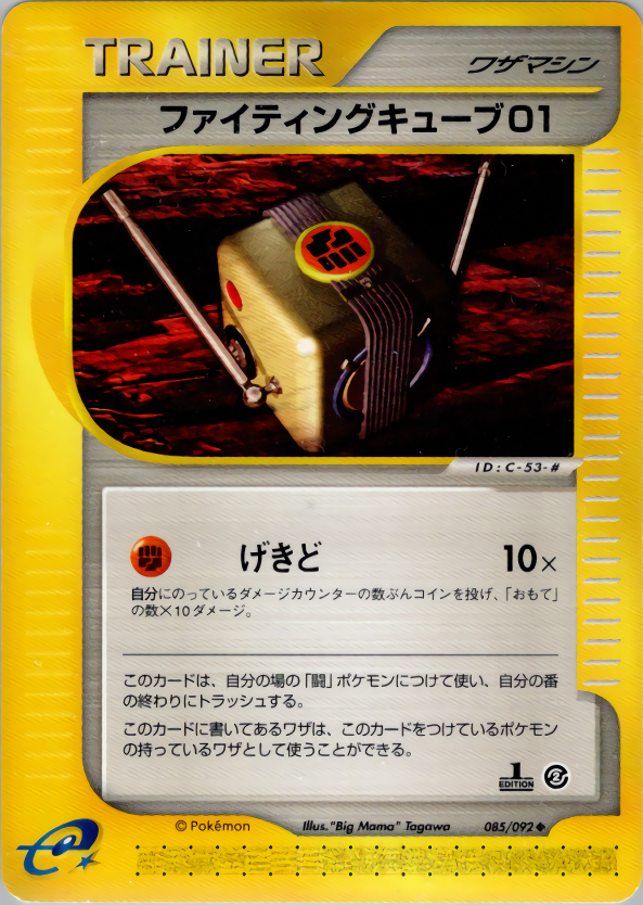 このカードは、自分の場の「闘」ポケモンにつけて使い、自分の番の終わりにトラッシュする。このカードに書いてあるワザは、このカードをつけているポケモンの持っているワザとして使うことができる。