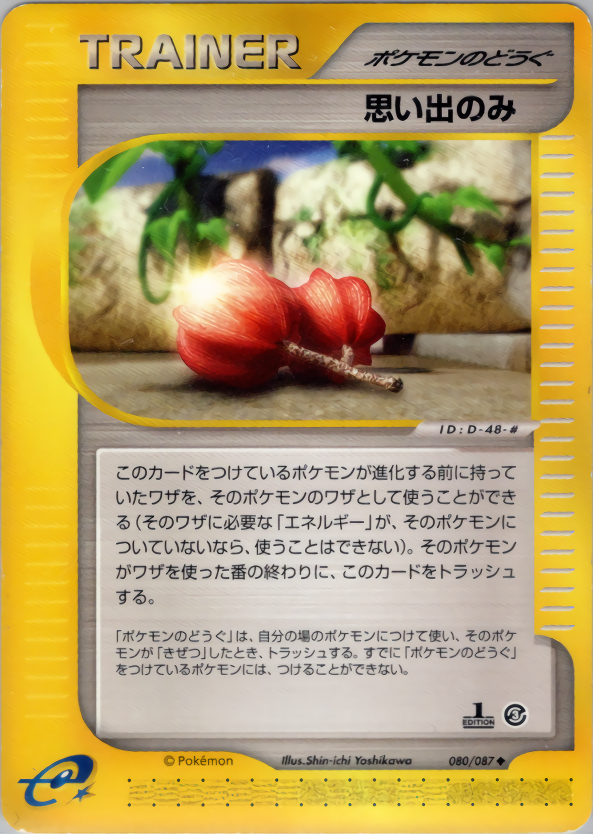 このカードをつけているポケモンが進化する前に持っていたワザを、そのポケモンのワザとして使うことができる(そのワザに必要な「エネルギー」が、そのポケモンについていないなら、使うことはできない)。そのポケモンがワザを使った番の終わりに、このカードをトラッシュする。