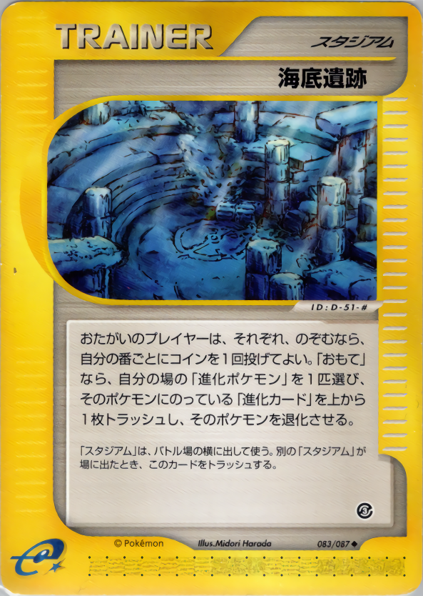 おたがいのプレイヤーは、それぞれ、のぞむなら、自分の番ごとにコインを1回投げてよい。「おもて」なら、自分の場の「進化ポケモン」を1匹選び、そのポケモンにのっている「進化カード」を上から1枚トラッシュし、そのポケモンを退化させる。