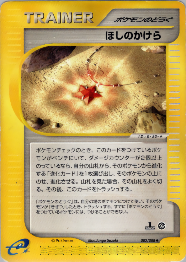 ポケモンチェックのとき、このカードをつけているポケモンがベンチにいて、ダメージカウンターが2個以上のっているなら、自分の山札から、そのポケモンから進化する「進化カード」を1枚選び出し、そのポケモンの上にのせ、進化させる。山札を見た場合、その山札をよく切る。その後、このカードをトラッシュする。
