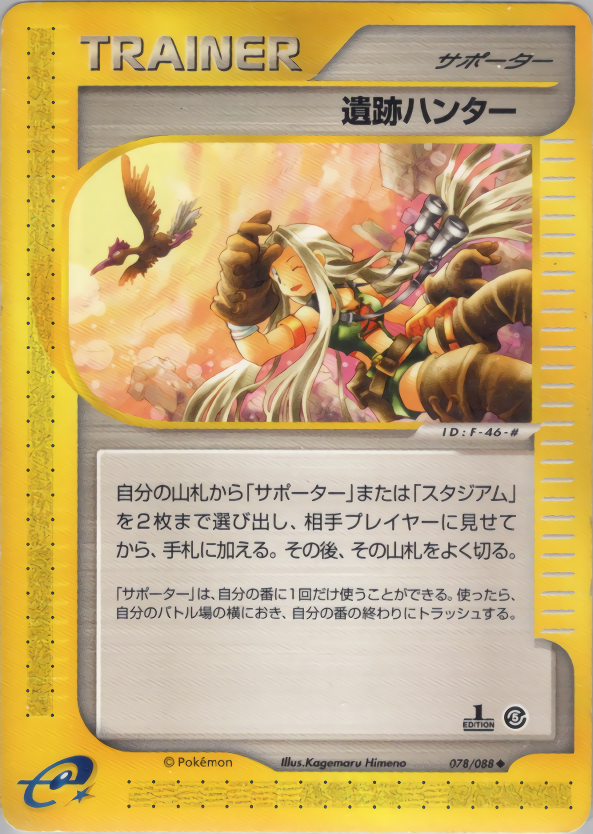 自分の山札から「サポーター」または「スタジアム」を2枚まで選び出し、相手プレイヤーに見せてから、手札に加える。その後、その山札をよく切る。
