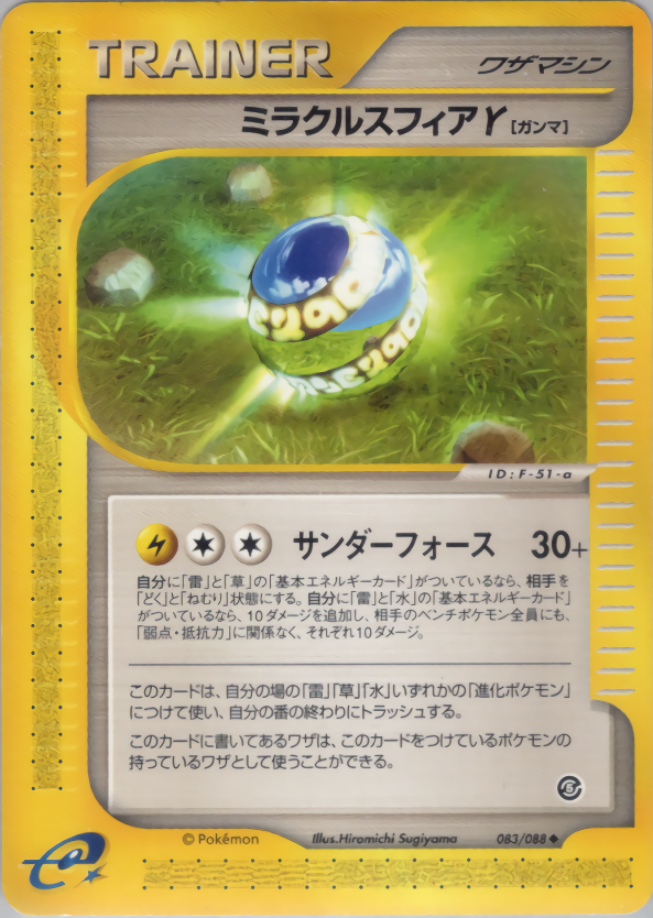 自分に「雷」と「草」の「基本エネルギーカード」がついているなら、相手を「どく」と「ねむり」状態にする。自分に「雷」と「水」の「基本エネルギーカード」がついているなら、10ダメージを追加し、相手のベンチポケモン全員にも、「弱点・抵抗力」に関係なく、それぞれ10ダメージ。