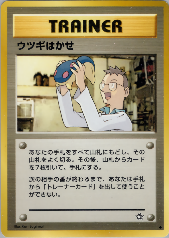 あなたの手札をすべて山札にもどし、その山札をよく切る。その後、山札からカードを7枚引いて、手札にする。次の相手の番が終わるまで、あなたは手札から「トレーナーカード」を出して使うことができない。