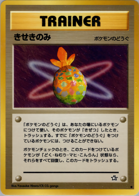 ポケモンチェックのとき、このカードをつけているポケモンが「どく・ねむり・マヒ・こんらん」状態なら、それらをすべて回復し、このカードをトラッシュする。
