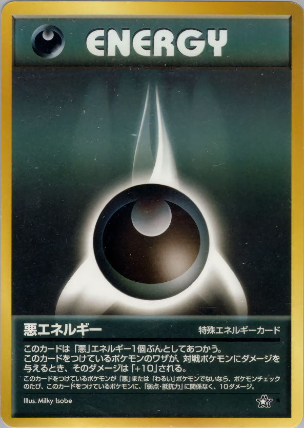 このカードは「悪」エネルギー1個ぶんとしてあつかう。このカードをつけているポケモンのワザが、対戦ポケモンにダメージを与えるとき、そのダメージは「+10」される。