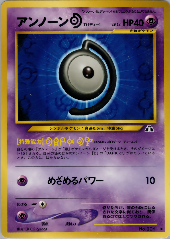 自分の場の「アンノーン」が「悪」ポケモンからダメージを受けるとき、そのダメージは、「-30」される。自分の場のほかのアンノーン「D」の「DARK df」がはたらいているとき、この力は、はたらかない。
