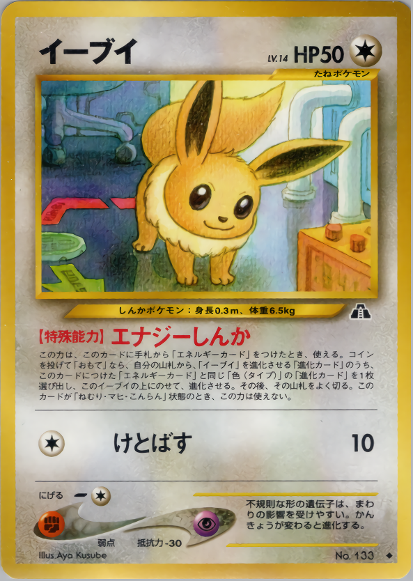 この力は、このカードに手札から「エネルギーカード」をつけたとき、使える。コインを投げて「おもて」なら、自分の山札から、「イーブイ」を進化させる「進化カード」のうち、このカードにつけた「エネルギーカード」と同じ「色(タイプ)」の「進化カード」を1枚選び出し、このイーブイの上にのせて、進化させる。その後、その山札をよく切る。このカードが「ねむり・マヒ・こんらん」状態のとき、この力は使えない。