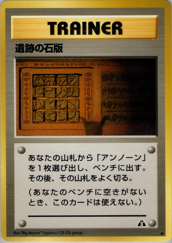 あなたの山札から「アンノーン」を1枚選び出し、ベンチに出す。その後、その山札をよく切る。(あなたのベンチに空きがないとき、このカードは使えない。)