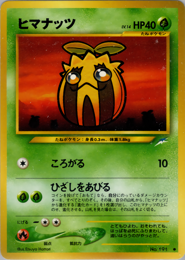コインを投げて「おもて」なら、自分にのっているダメージカウンターを、すべてとりのぞく。その後、自分の山札から、「ヒマナッツ」から進化する「進化カード」を1枚選び出し、このヒマナッツの上にのせ、進化させる。山札を見た場合は、その山札をよく切る。