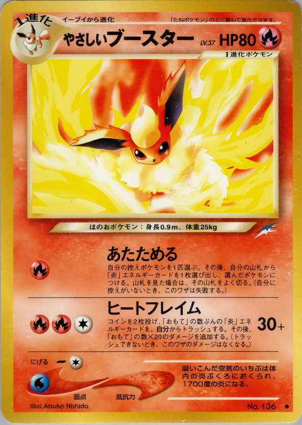 自分の控えポケモンを1匹選ぶ。その後、自分の山札から「炎」エネルギーカードを1枚選び出し、選んだポケモンにつける。山札を見た場合は、その山札をよく切る。(自分に控えがいないとき、このワザは失敗する。)