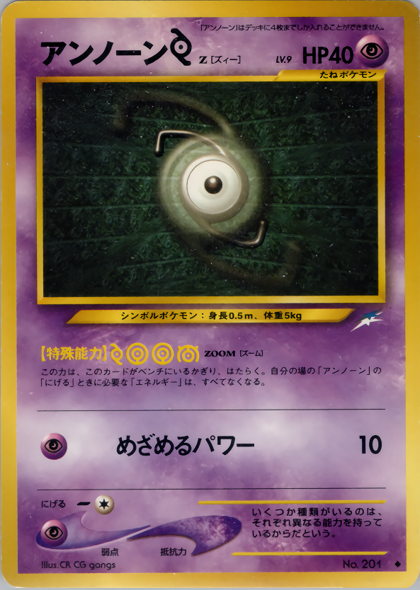 この力は、このカードがベンチにいるかぎり、はたらく。自分の場の「アンノーン」の「にげる」ときに必要な「エネルギー」は、すべてなくなる。