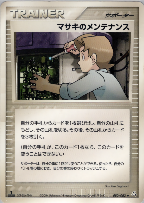 自分の手札からカードを1枚選び出し、自分の山札にもどし、その山札を切る。その後、その山札からカードを3枚引く。(自分の手札が、このカード1枚なら、このカードを使うことはできない。)