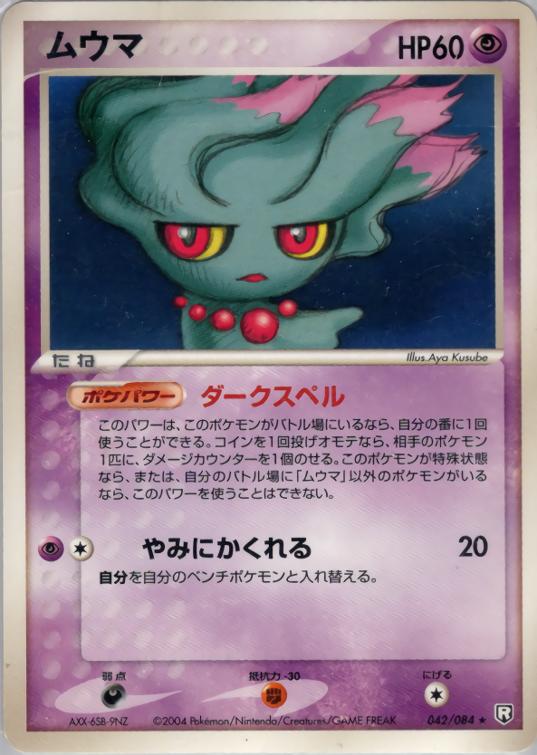 このパワーは、このポケモンがバトル場にいるなら、自分の番に1回使うことができる。コインを1回投げオモテなら、相手のポケモン1匹に、ダメージカウンターを1個のせる。このポケモンが特殊状態なら、または、自分のバトル場に「ムウマ」以外のポケモンがいるなら、このパワーを使うことはできない。