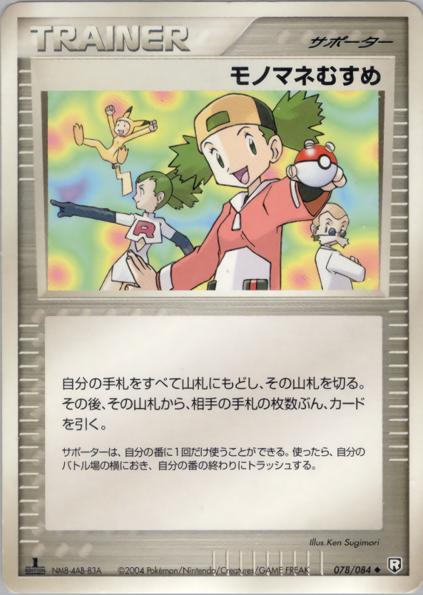 自分の手札をすべて山札にもどし、その山札を切る。その後、その山札から、相手の手札の枚数ぶん、カードを引く。