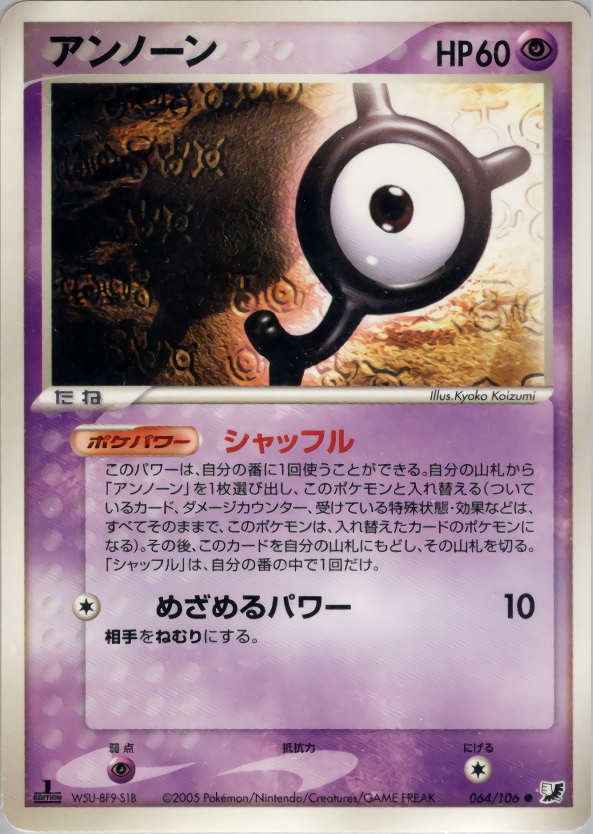 このパワーは、自分の番に1回使うことができる。自分の山札から「アンノーン」を1枚選び出し、このポケモンと入れ替える(ついているカード、ダメージカウンター、受けている特殊状態・効果などは、すべてそのままで、このポケモンは、入れ替えたカードのポケモンになる)。その後、このカードを自分の山札にもどし、その山札を切る。「シャッフル」は、自分の番の中で1回だけ。