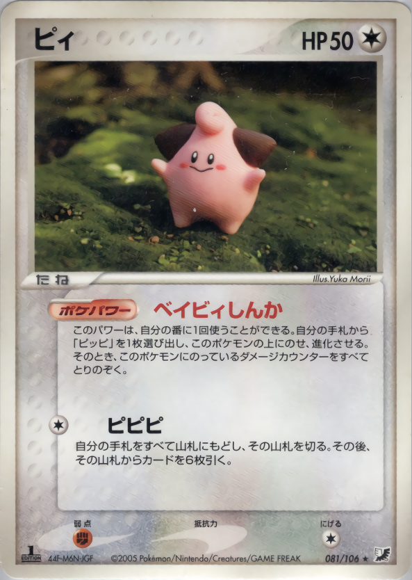 このパワーは、自分の番に1回使うことができる。自分の手札から、「ピッピ」を1枚選び出し、このポケモンの上にのせ、進化させる。そのとき、このポケモンにのっているダメージカウンターをすべてとりのぞく。
