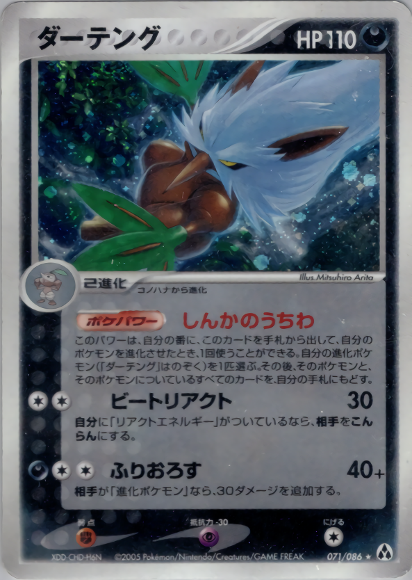 このパワーは、自分の番に、このカードを手札から出して、自分のポケモンを進化させたとき、1回使うことができる。自分の進化ポケモン(「ダーテング」はのぞく)を1匹選ぶ。その後、そのポケモンと、そのポケモンについているすべてのカードを、自分の手札にもどす。