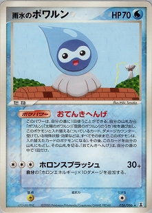 このパワーは、自分の番に1回使うことができる。自分の山札から「ポワルン」「太陽のポワルン」「雪雲のポワルン」のうち1枚を選び出し、このポケモンと入れ替える(ついているカード、ダメージカウンター、受けている特殊状態・効果などは、すべてそのままで、このポケモンは、入れ替えたカードのポケモンになる)。その後、このカードを自分の山札にもどし、その山札を切る。「おてんきへんげ」は、自分の番の中で1回だけ。