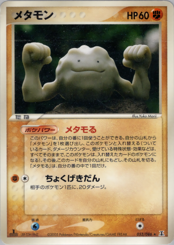 このパワーは、自分の番に1回使うことができる。自分の山札から「メタモン」を1枚選び出し、このポケモンと入れ替える(ついているカード、ダメージカウンター、受けている特殊状態・効果などは、すべてそのままで、このポケモンは、入れ替えたカードのポケモンになる)。その後、このカードを自分の山札にもどし、その山札を切る。「メタモる」は、自分の番の中で1回だけ。