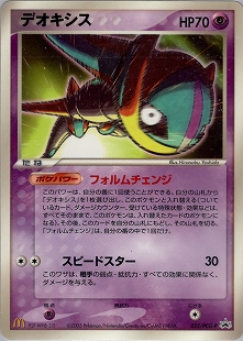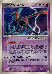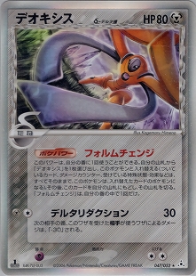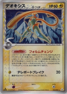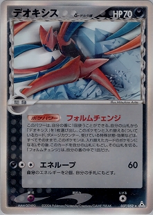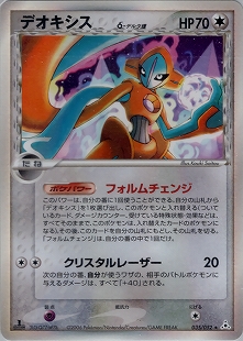 このパワーは、自分の番に1回使うことができる。自分の山札から 「デオキシス」を1枚選び出し、このポケモンと入れ替える(ついて いるカード、ダメージカウンター、受けている特殊状態・効果などは、 すべてそのままで、このポケモンは、入れ替えたカードのポケモンに なる)。その後、このカードを自分の山札にもどし、その山札を切る。 「フォルムチェンジ」は、自分の番の中で1回だけ。