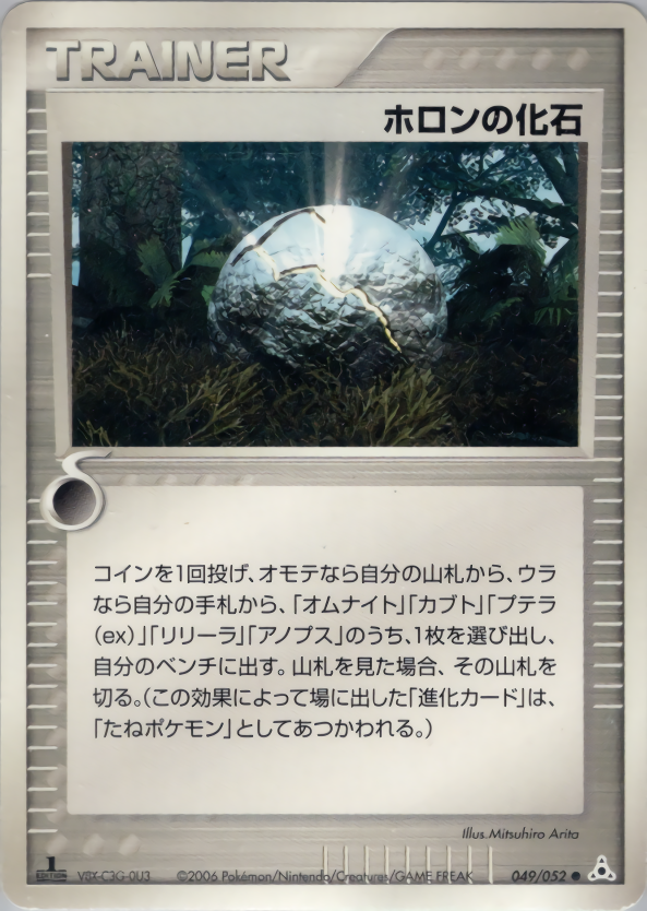 コインを1回投げ、オモテなら自分の山札から、ウラ なら自分の手札から、「オムナイト」「カブト」「プテラ (ex)」「リリーラ」「アノプス」のうち、1枚を選び出し、 自分のベンチに出す。山札を見た場合、その山札を 切る。(この効果によって場に出した「進化カード」は、 「たねポケモン」としてあつかわれる。)